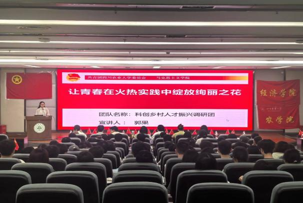 青年是社会的中坚力量,科创乡村人才振兴调研团成员郭果现身说法,用实践展现青春最亮丽的底色;“驱螺福稻”社会实践团队负责人王奎巧用专业知识,实地调研田间地头,为村民解决福寿螺难题。两位优秀社会实践的代表清晰描绘出社会实践的价值内涵,引导团员青年探索实践创新与学院特色结合的新路径。